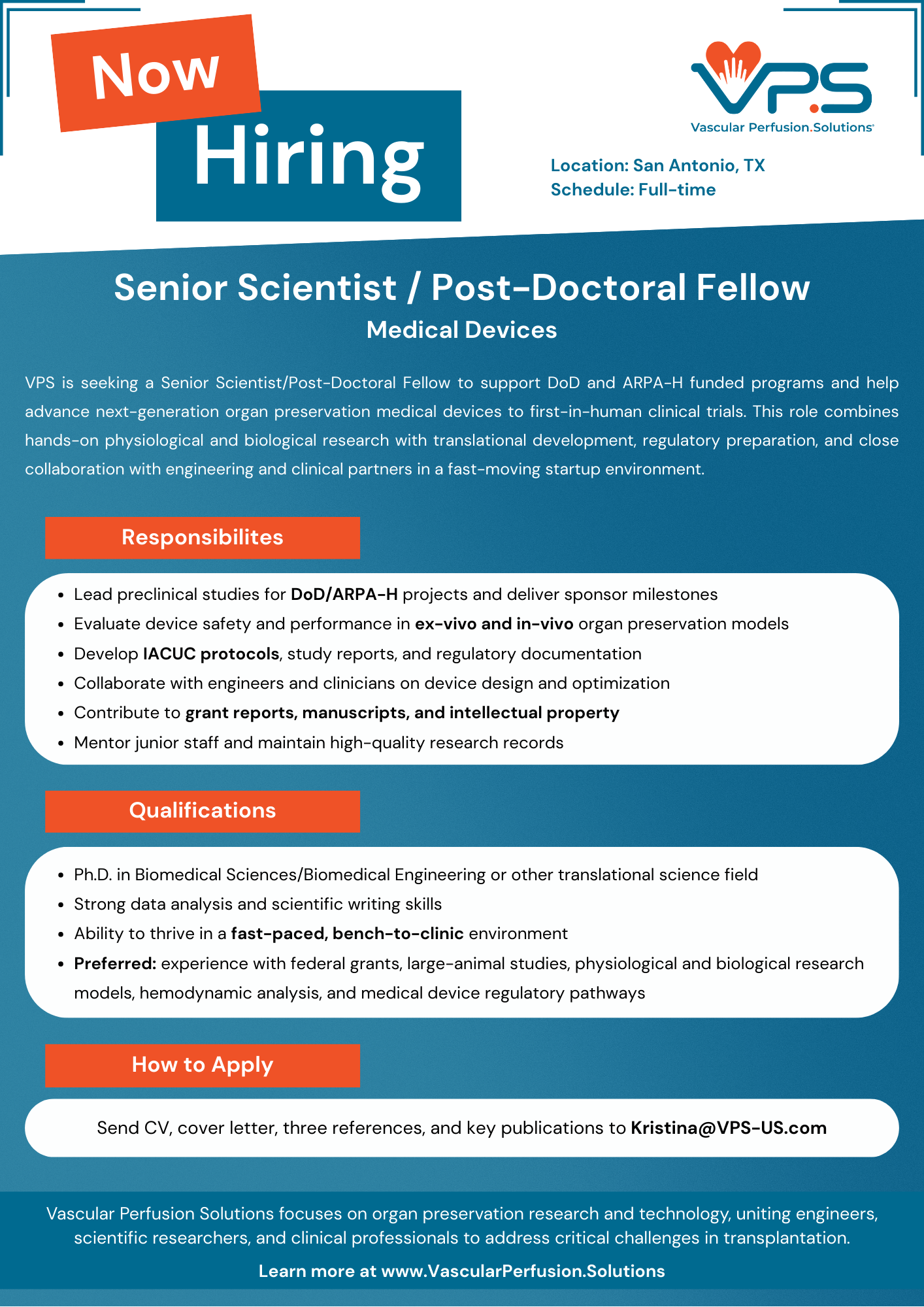 Vascular Perfusion Solutions, Inc. is hiring a Senior Scientist / Post-Doctoral Fellow to support DoD and ARPA-H funded programs advancing next-generation organ preservation technologies toward first-in-human clinical trials.